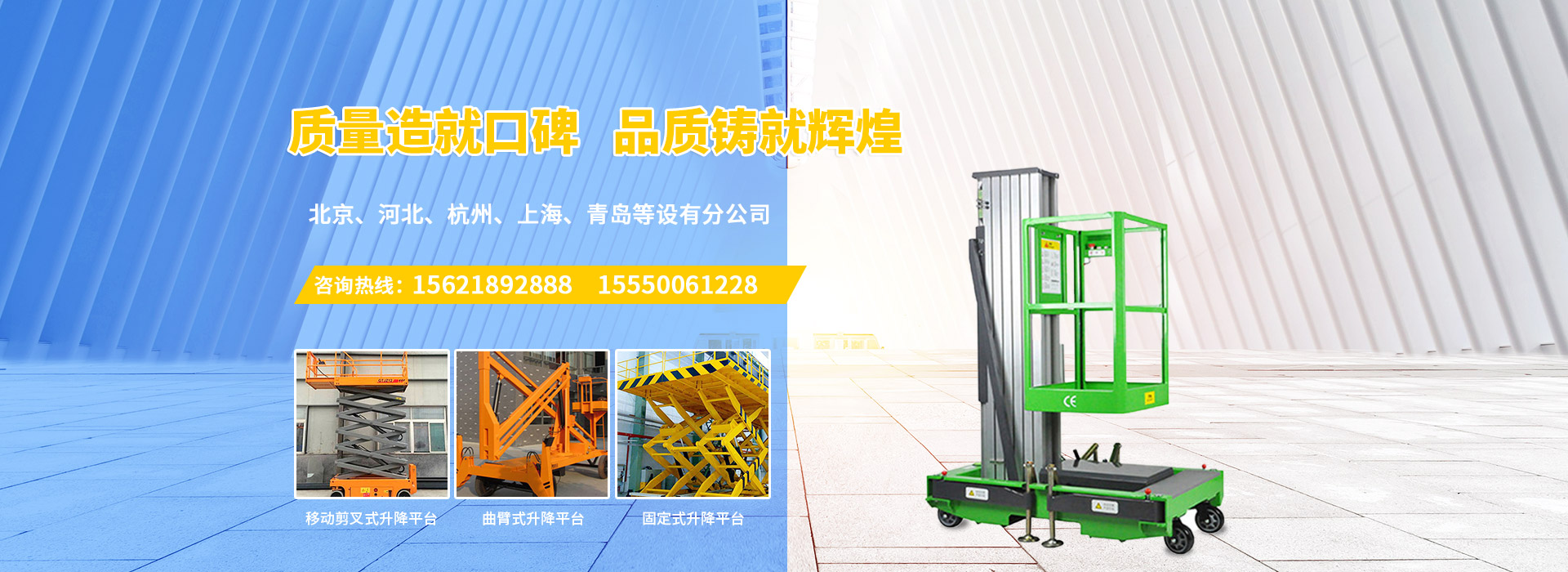 济南庆飞机械设备有限公司目前专心致力于液压升降平台领域。公司主要产品有:剪叉移动式升降平台,剪叉式固定升降平台、铝合金直臂升降平台、折臂式升降平台、曲臂式升降平台、车载式升降平台、牵引式升降平台、自动行走式升降平台、移动式固定式登车桥、桅柱式铝合金升降平台、铝合金升降舞台、固定轨道台面旋转式升降平台等,产品广泛适用于电力、通讯、路灯、交通、交警、建筑装簧、园林、广告、高速公路、大型厂矿企业等领域,还可根据用户的需求设计制造包括特殊尺寸、承载能力、防爆电器的液压升降台。